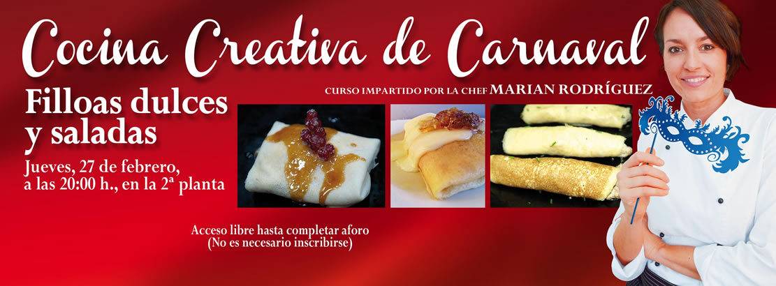 El Centro Comercial Arousa acogerá el próximo jueves 27, a partir de las 20:00 h. y en la segunda planta, Cocina de Carnaval, un nuevo curso donde los asistentes aprenderán a aportar un toque de creatividad a la tradicional y popularmente conocida receta de las filloas gallegas, tanto en cuanto a los ingredientes como en su presentación.