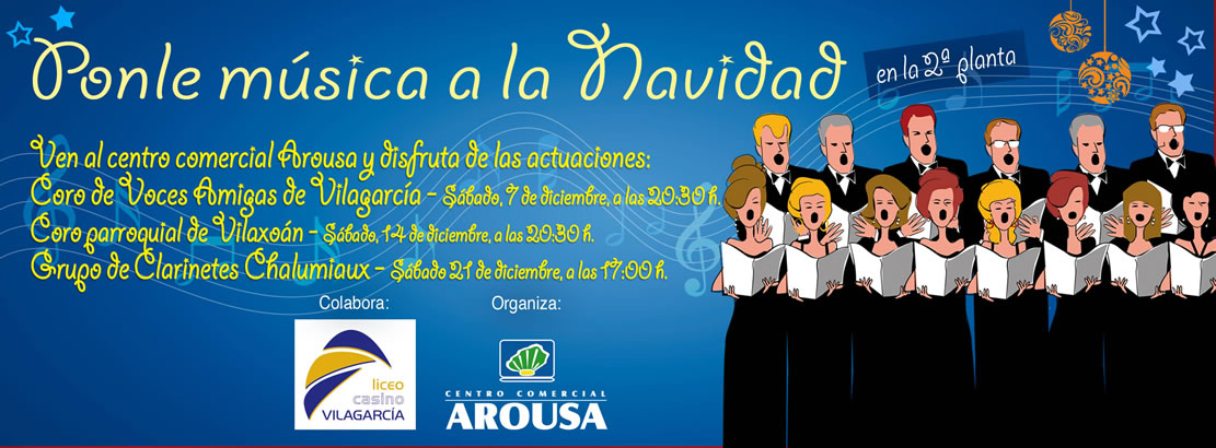 El Centro Comercial Arousa celebrará este sábado día 7 el primero de los tres conciertos de Ponle música a la Navidad, una iniciativa que nace con el objetivo de amenizar las compras navideñas, y que contará con la participación del Coro Voces Amigas de Vilagarcía, Coro Parroquial de Vilaxoán y el grupo de clarinetes Chalumiaux, que serán los responsables de poner la banda sonora.