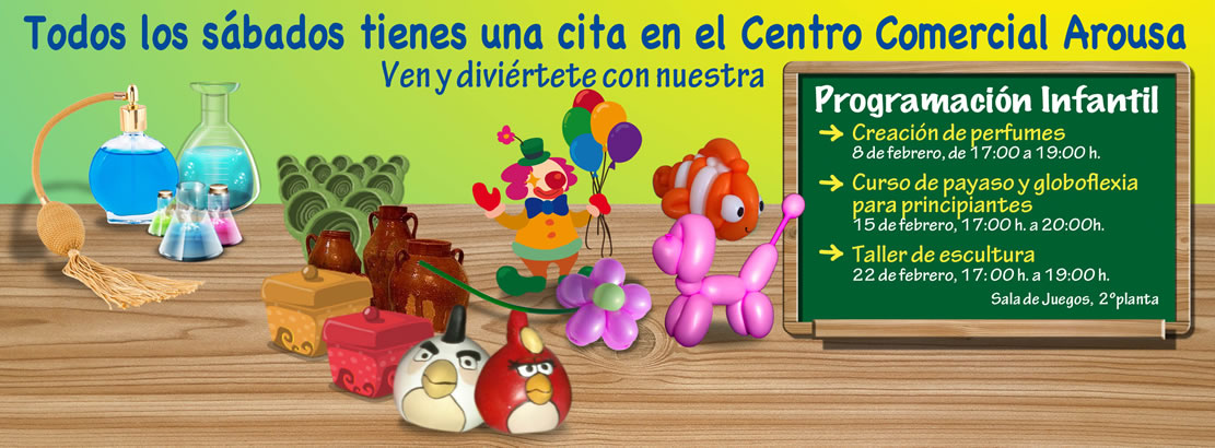 Talleres para iniciarse en el arte de la escultura, de creación de perfumes o para aprender a realizar divertidas figuras de globoflexia son algunas de las nuevas propuestas de actividades que el centro comercial Arousa pondrá en marcha desde este sábado y hasta el 22 de febrero, en la Sala de Juegos de la 2ª planta, y dirigidas al público infantil.